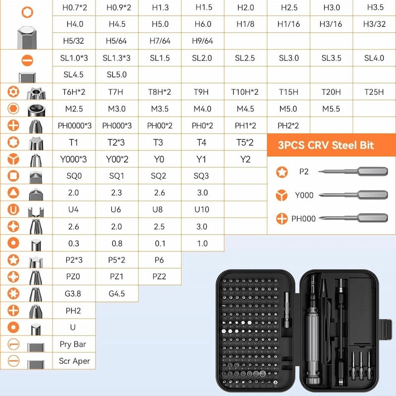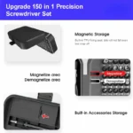 مجموعة مفكات البراغي الدقيقة 150 في 1 هي الحل الشامل لإصلاح أي شيء تقريبًا، بدءًا من الهواتف الذكية وحتى أجهزة الكمبيوتر المحمولة والإلكترونيات الصغيرة. فهو مزود بمجموعة واسعة من البتات والأدوات الذكية، ويمنحك الدقة والتحكم والراحة في كل إصلاح. صغير الحجم ومنظم ومصمم لكل من المحترفين ومستخدمي الأعمال اليدوية، فهو يحول الإصلاحات الصعبة إلى مهام بسيطة —مما يجعلك جاهزًا لأي إصلاح في أي وقت.