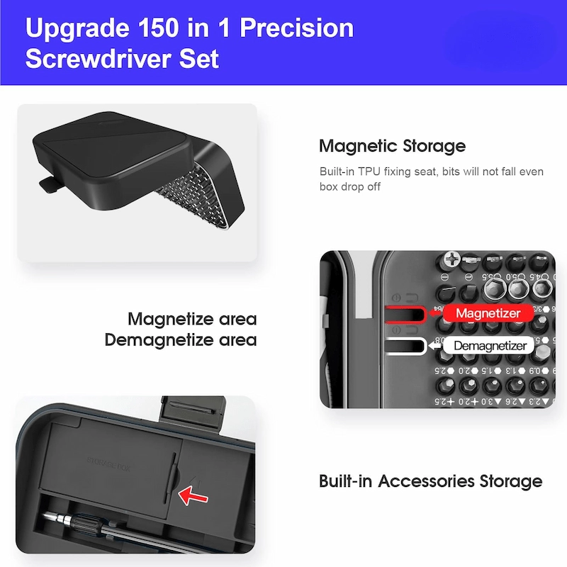 مجموعة أدوات كاملة 150 في 1 – تتضمن 120 قطعة مفك براغي مغناطيسية + 30 أداة إضافية، تغطي كل احتياجات الإصلاح تقريبًا.توافق واسع للإلكترونيات – مثالي لإصلاح الهواتف وأجهزة الكمبيوتر المحمولة وأجهزة الكمبيوتر الشخصية والكاميرات والساعات وأجهزة الألعاب والنظارات والمزيد.رؤوس مفكات البراغي المغناطيسية – تساعد الرؤوس المغناطيسية القوية على التقاط البراغي والإمساك بها بسهولة، مما يمنع فقدانها أثناء الإصلاحات.رؤوس فولاذية من سبائك CR-V عالية الجودة – مادة متينة ومقاومة للتآكل ذات صلابة عالية تضمن الدقة وعمرًا طويلاً.تنوع البتات الدقيقة – يتضمن أنواعًا متعددة من البتات (Phillips، Torx، Hex، وما إلى ذلك) للتعامل مع أنواع وأحجام البراغي المختلفة.مقبض مريح مضاد للانزلاق – تصميم قبضة مريح يسمح بتحكم أفضل وتقليل إجهاد اليد أثناء الاستخدام الطويل.أعمدة تمديد مرنة وصلبة – تأتي مع قضبان تمديد مرنة وصلبة للوصول إلى المساحات الضيقة أو العميقة بسهولة.نظام بت قابل للتبديل – تبديل بت سريع وسهل لسير عمل فعال عبر مهام الإصلاح المختلفة.حقيبة تخزين منظمة مدمجة – حقيبة مرتبة بشكل أنيق تحافظ على الأدوات منظمة وقابلة للحمل وسهلة الوصول إليها.خفيف الوزن وسهل السفر – الحجم الصغير والوزن الذي يمكن التحكم فيه يجعله مثاليًا للإصلاحات المنزلية أو المكتبية أو أثناء التنقل.الاستخدام الاحترافي والاستخدام الذاتي – مناسب لكل من الفنيين والمستخدمين العاديين الذين يريدون مجموعة إصلاح موثوقة.القدرة على الإصلاح الدقيق – مصممة للمهام الدقيقة مثل اللوحات الأم والإلكترونيات الصغيرة والمكونات الدقيقة.أداء متين وطويل الأمد – تخضع البتات لاختبارات الجودة لضمان الاستقرار ومقاومة التجريد.