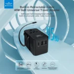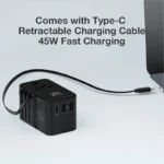 شحن سريع بقوة 45 وات من GaN – مدعوم بتقنية GaN III لشحن أسرع وأكثر كفاءة مع حرارة أقل.3 منافذ شحن + منفذ تيار متردد – يتضمن منفذ USB-C PD واحد ومنفذي USB-A بالإضافة إلى مقبس تيار متردد، مما يسمح لك بتشغيل أجهزة متعددة في وقت واحد.كابل USB-C مدمج قابل للسحب – كابل مدمج قابل للسحب (~70 سم) لشحن مريح وخالٍ من التشابك أثناء التنقل.شحن ما يصل إلى 4 أجهزة في وقت واحد – يتيح لك التصميم متعدد المنافذ تشغيل الهواتف الذكية والأجهزة اللوحية وأجهزة الكمبيوتر المحمولة والملحقات في وقت واحد.USB-C Power Delivery (PD) 45W – شحن عالي السرعة مناسب للهواتف الذكية والأجهزة اللوحية وحتى أجهزة الكمبيوتر المحمولة خفيفة الوزن.دعم الشحن السريع – تدعم منافذ USB-A تقنيات الشحن السريع مثل الشحن السريع للأجهزة المتوافقة.محول سفر عالمي – مزود بأنواع مقابس الولايات المتحدة والمملكة المتحدة والاتحاد الأوروبي وأستراليا للتوافق العالمي.يعمل في 200+ دولة – مصمم للسفر الدولي مع توافق عالمي واسع مع المقابس.مدخل جهد واسع (100-250 فولت) – يدعم معايير الجهد العالمية للاستخدام في أي مكان تقريبًا.تصنيف طاقة تيار متردد عالي – يدعم مقبس التيار المتردد ما يصل إلى 2500 واط (10 أمبير كحد أقصى) للأجهزة المتوافقة.تصميم مدمج وصديق للسفر – جسم صغير وخفيف الوزن (حوالي 226 جرامًا) يجعل من السهل حمله في الأمتعة أو حقائب الظهر.شريحة الشحن الذكية (Auto-ID) – تكتشف الأجهزة المتصلة تلقائيًا وتوفر سرعة شحن مثالية.حماية أمان متقدمة – تشمل حماية مزدوجة للصمام، وحماية من زيادة التيار، وحماية من ماس كهربائي، وحماية من ارتفاع درجة الحرارة.غلاف مقاوم للهب والصدمات – توفر المواد المتينة أمانًا إضافيًا أثناء السفر والاستخدام اليومي.توافق واسع مع الأجهزة – متوافق مع أجهزة iPhone وهواتف Android والأجهزة اللوحية وأجهزة الكمبيوتر المحمولة والكاميرات وسماعات الأذن وأجهزة USB الأخرى.