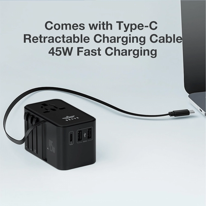 محول سفر Brave Travel 45 W Gan 3 منافذ + تيار متردد مع كابل قابل للسحب