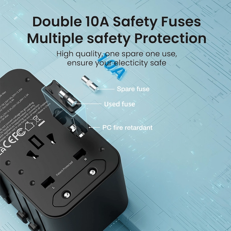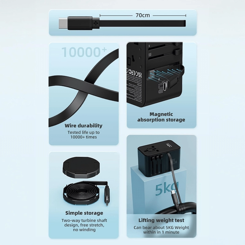 شحن سريع بقوة 45 وات من GaN – مدعوم بتقنية GaN III لشحن أسرع وأكثر كفاءة مع حرارة أقل.3 منافذ شحن + منفذ تيار متردد – يتضمن منفذ USB-C PD واحد ومنفذي USB-A بالإضافة إلى مقبس تيار متردد، مما يسمح لك بتشغيل أجهزة متعددة في وقت واحد.كابل USB-C مدمج قابل للسحب – كابل مدمج قابل للسحب (~70 سم) لشحن مريح وخالٍ من التشابك أثناء التنقل.شحن ما يصل إلى 4 أجهزة في وقت واحد – يتيح لك التصميم متعدد المنافذ تشغيل الهواتف الذكية والأجهزة اللوحية وأجهزة الكمبيوتر المحمولة والملحقات في وقت واحد.USB-C Power Delivery (PD) 45W – شحن عالي السرعة مناسب للهواتف الذكية والأجهزة اللوحية وحتى أجهزة الكمبيوتر المحمولة خفيفة الوزن.دعم الشحن السريع – تدعم منافذ USB-A تقنيات الشحن السريع مثل الشحن السريع للأجهزة المتوافقة.محول سفر عالمي – مزود بأنواع مقابس الولايات المتحدة والمملكة المتحدة والاتحاد الأوروبي وأستراليا للتوافق العالمي.يعمل في 200+ دولة – مصمم للسفر الدولي مع توافق عالمي واسع مع المقابس.مدخل جهد واسع (100-250 فولت) – يدعم معايير الجهد العالمية للاستخدام في أي مكان تقريبًا.تصنيف طاقة تيار متردد عالي – يدعم مقبس التيار المتردد ما يصل إلى 2500 واط (10 أمبير كحد أقصى) للأجهزة المتوافقة.تصميم مدمج وصديق للسفر – جسم صغير وخفيف الوزن (حوالي 226 جرامًا) يجعل من السهل حمله في الأمتعة أو حقائب الظهر.شريحة الشحن الذكية (Auto-ID) – تكتشف الأجهزة المتصلة تلقائيًا وتوفر سرعة شحن مثالية.حماية أمان متقدمة – تشمل حماية مزدوجة للصمام، وحماية من زيادة التيار، وحماية من ماس كهربائي، وحماية من ارتفاع درجة الحرارة.غلاف مقاوم للهب والصدمات – توفر المواد المتينة أمانًا إضافيًا أثناء السفر والاستخدام اليومي.توافق واسع مع الأجهزة – متوافق مع أجهزة iPhone وهواتف Android والأجهزة اللوحية وأجهزة الكمبيوتر المحمولة والكاميرات وسماعات الأذن وأجهزة USB الأخرى.