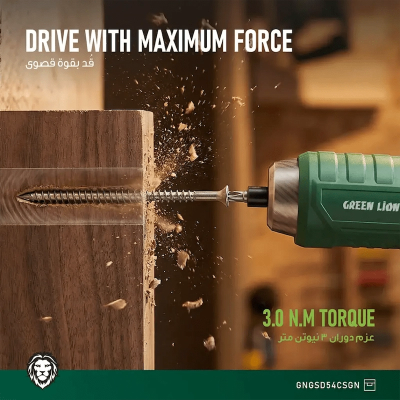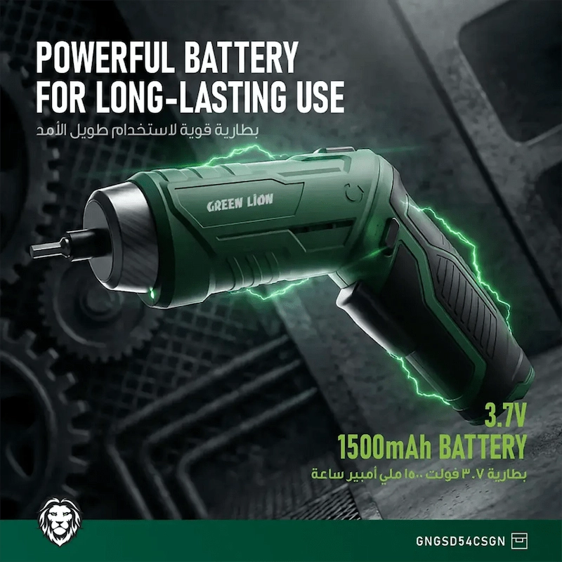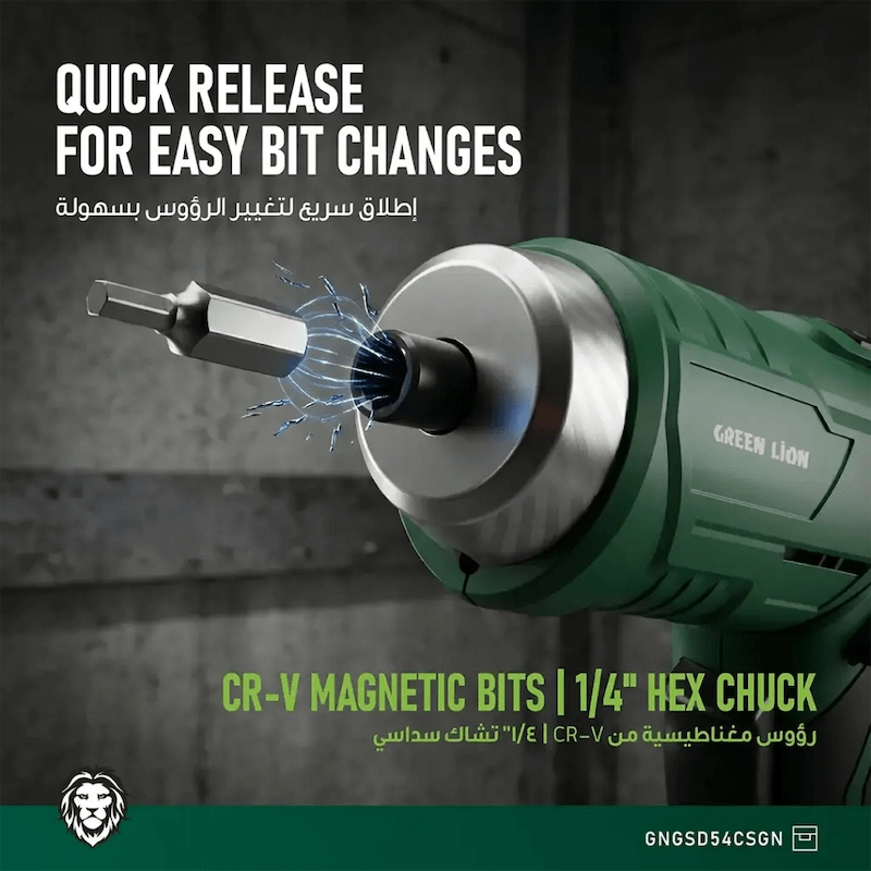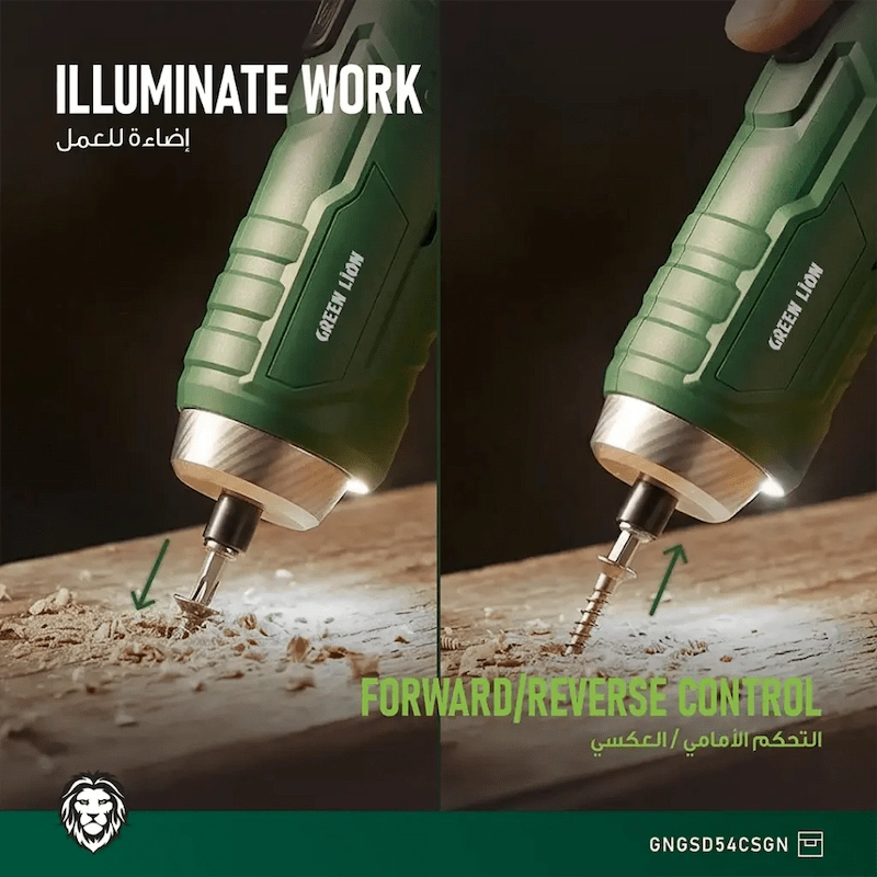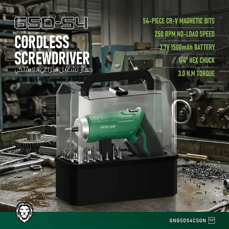 أداة واحدة. 54 احتمالا. يعد Green Lion GSD-54 مفك البراغي اللاسلكي المفضل لديك لكل إصلاح في المنزل. مقبض قابل للتعديل 90°، وبتات مغناطيسية CR-V، ومصباح عمل LED، وشحن USB-C — كل ذلك معبأ في أداة واحدة أنيقة وقوية. لا يوجد سلك. لا حدود. مجرد نتائج.