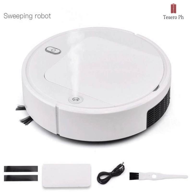 Comes with included accessories: cleaning brush, cleaning cloth, sanitizer filling bottle (for mop function) and USB cable for charging.
