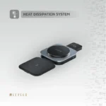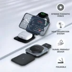 محطة شحن لاسلكية 3‑في‑1 – اشحن هاتفك الذكي وساعتك الذكية وسماعات الأذن مرة واحدة على جهاز صغير الحجم واحد. شحن لاسلكي سريع بقدرة 15 وات – يوفر ما يصل إلى 15 وات للهواتف المتوافقة، مع مستويات إخراج إضافية مثل 7.5 وات، و5 وات، و3.5 وات للأجهزة الأخرى. نظام تبديد الحرارة – يحافظ على برودة الأجهزة أثناء الشحن لمنع ارتفاع درجة الحرارة وضمان توصيل الطاقة بشكل آمن. قوة مغناطيسية قوية – تثبت هاتفك بشكل آمن في مكانه للشحن المستمر. حماية السلامة المدمجة ‑ تحمي من ارتفاع– درجة الحرارة والتيار الزائد والإخراج غير المستقر عند شحن أجهزة متعددة. قابلة للطي والسفر‑تصميم مريح – هيكل صغير الحجم وقابل للطي يجعل من السهل حملها في الحقائب للسفر أو العمل.هيكل خفيف الوزن – مصنوع من مادة PC المتميزة، وABS، وسبائك الألومنيوم، وجلد PU، ويزن حوالي 112 جرامًا.أبعاد مدمجة – مساحة صغيرة عند طيها (تقريبًا. 76.5 × 76.5 × 19.5 ملم)، مثالي لأجهزة الكمبيوتر المكتبية أو الطاولات الليلية أو حقائب السفر.دعم Qi العالمي – متوافق مع الأجهزة التي تدعم Qi‑ مثل أجهزة iPhone وAirPods وهواتف Samsung وGalaxy Buds وApple Watch وأدوات الشحن اللاسلكية‑ الأخرى.مستويات إخراج متعددة – يضمن خرج الطاقة المرن (15 وات/7.5 وات/5 وات/3.5 وات) شحنًا فعالًا مصممًا خصيصًا لكل جهاز متصل.