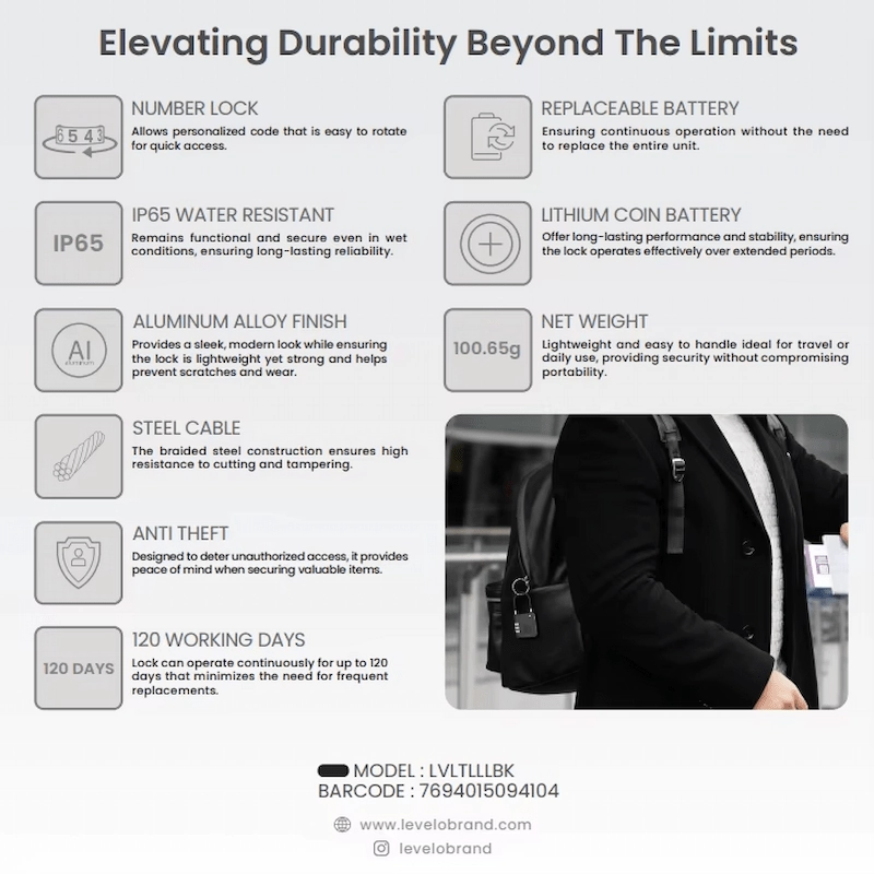Lock up your belongings securely with the Levelo TabiLock, a reliable travel buddy for journeys free of theft and annoyance.With an enduring 120 days of work time