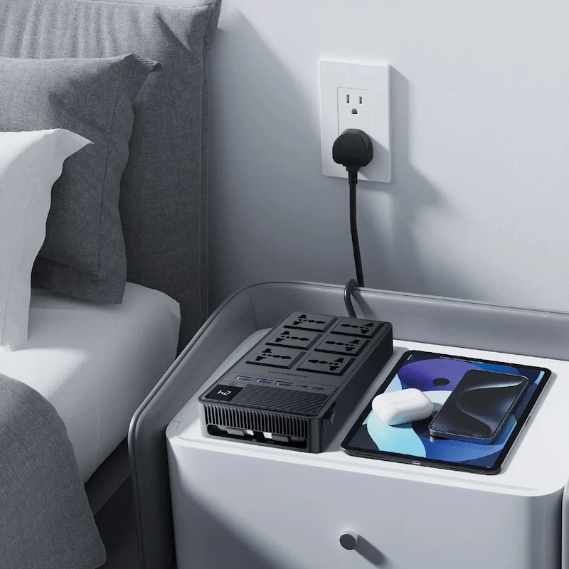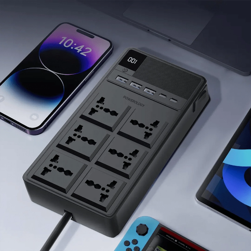 قم بتعزيز عالمك بأناقة باستخدام شريط الطاقة Powerology 2500W 6AC.مع 6 منافذ وكابلات مدمجة قابلة للسحب وتصميم أسود أنيق، فإنه يحافظ على تنظيم مساحتك مع توفير أداء قوي وحماية نهائية للجهاز مثالية لكل من المنزل والمكتب.