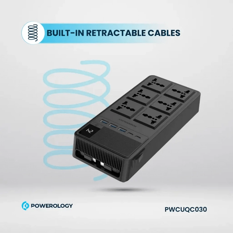 شريط طاقة Powerology 2500W 6AC مع كابلات مدمجة قابلة للسحب