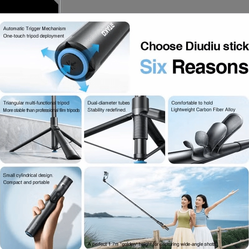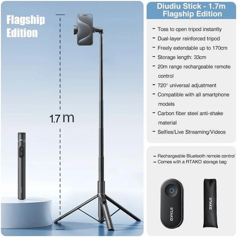 طول قابل للتمديد (حتى 170 سم) – التقط زوايا أوسع ومنظورات أعلى بسهولة.قاعدة حامل ثلاثي القوائم تفتح تلقائيًا – تتحول بسرعة إلى حامل ثلاثي القوائم مستقر للتصوير بدون استخدام اليدين.720° حامل هاتف دوار – دوران مرن للزوايا الرأسية والأفقية والإبداعية.جهاز التحكم عن بعد عبر البلوتوث – التحكم في الغالق لاسلكيًا مع نطاق تشغيل طويل.بطارية ريموت قابلة لإعادة الشحن – بطارية مدمجة للاستخدام المريح والمتكرر.التوافق العالمي للهاتف – يناسب معظم الهواتف الذكية بشكل آمن.تصميم مدمج وقابل للطي – قابل للطي لسهولة التخزين والسفر.تصميم مستقر ومضاد للاهتزاز – مصمم لتقليل الاهتزاز للحصول على صور ومقاطع فيديو أكثر وضوحًا.بناء متين – مصنوع من سبائك الألومنيوم القوية ومواد ABS عالية الجودة.استخدام متعدد الأغراض – مثالي لصور السيلفي والصور الجماعية ومدونات الفيديو والبث المباشر وتصوير السفر.