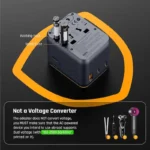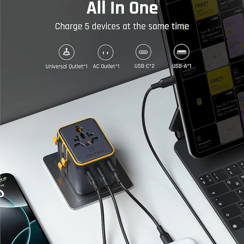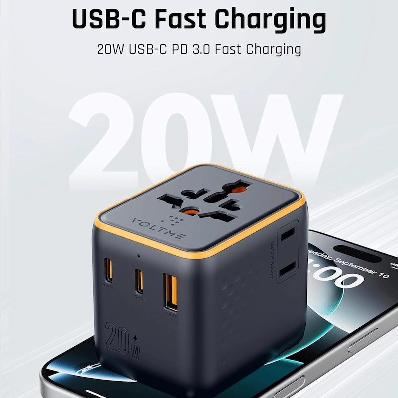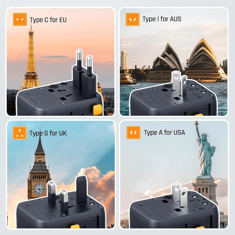 محول سفر عالمي مع أنواع متعددة من المقابس الدولية (الولايات المتحدة، المملكة المتحدة، الاتحاد الأوروبي، أستراليا)شحن سريع USB-C Power Delivery (PD) بقدرة 20 واتمنافذ شحن متعددة (USB-C و USB-A)دعم مأخذ طاقة التيار المتردديمكنه شحن أجهزة متعددة في نفس الوقتمتوافق مع أكثر من 200 دولةتقنية شحن ذكية مع كشف تلقائي للطاقةيدعم الهواتف الذكية والأجهزة اللوحية وسماعات الأذن وأجهزة USB الأخرىتصميم مدمج وخفيف الوزنمثالي للسفر والاستخدام اليوميحماية أمان مدمجة (حماية من التيار الزائد والجهد الزائد والسخونة الزائدة وقصر الدائرة)دعم طاقة عالية لأجهزة التيار المترددهيكل متين ومناسب للسفر