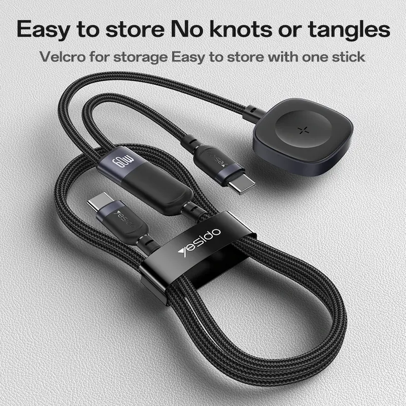 اشحن أجهزتك USB-C و iWatch في وقت واحد باستخدام كابل الشحن 2 في 1 Yesido CA136C. بفضل قدرته على الشحن السريع بقدرة 60 وات وطوله البالغ 1.2 متر، يوفر هذا الكابل الأسود الأنيق تنوعًا ومتانة وراحة في آن واحد. مثالي لمن يحتاجون إلى الطاقة أثناء التنقل.