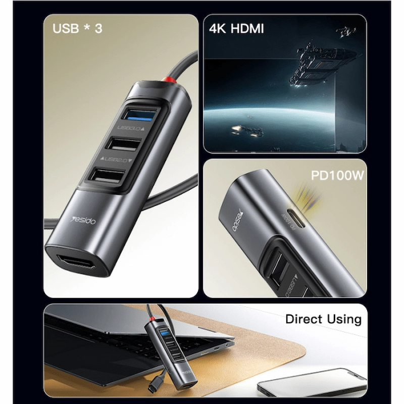 Yesido HB22 عبارة عن موزع USB-C متعدد الوظائف يتميز بثلاثة منافذ USB 3.0 ومخرج HDMI بدقة 4K ومنفذ شحن PD بقوة 100 وات. تم تصنيعه من سبائك الألومنيوم المتميزة لتحقيق المتانة ومقاومة الحرارة، وهو مثالي لتوسيع الاتصال على أجهزة الكمبيوتر المحمولة والأجهزة اللوحية والهواتف الذكية