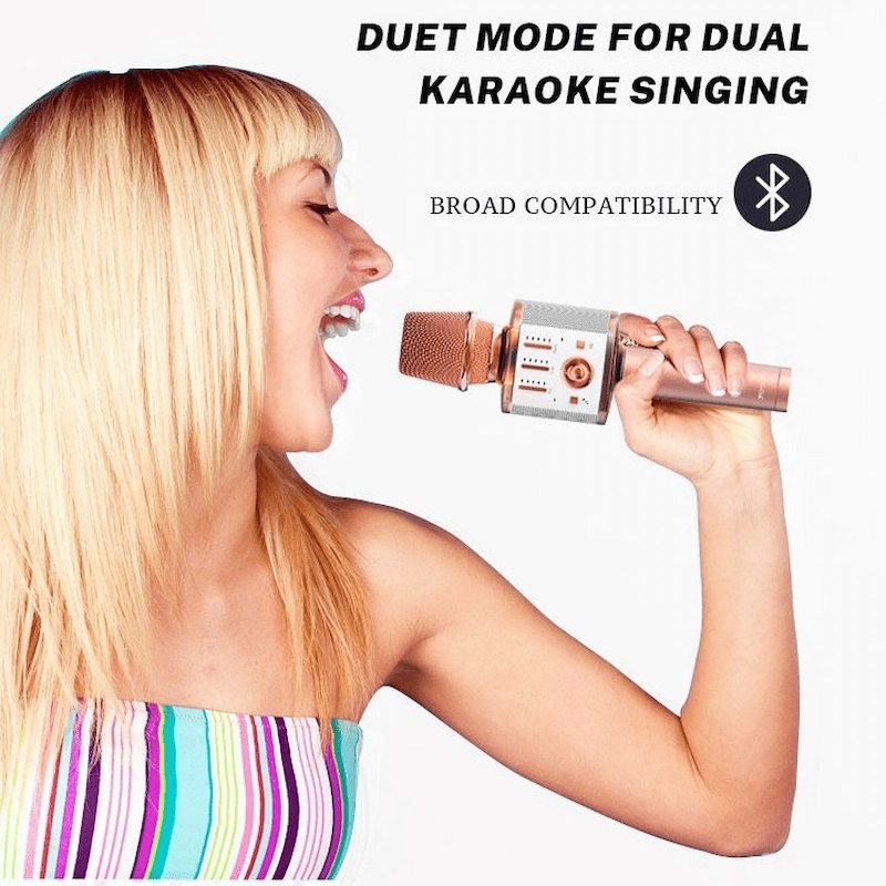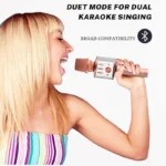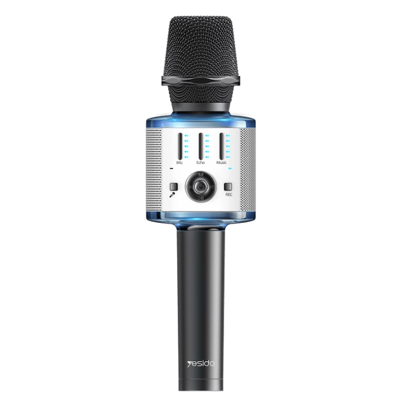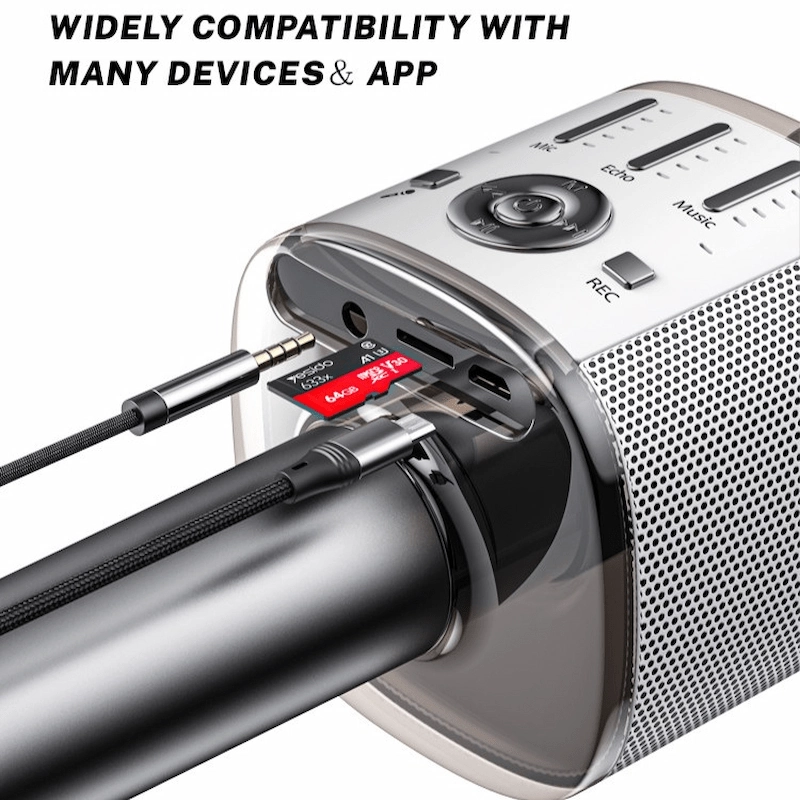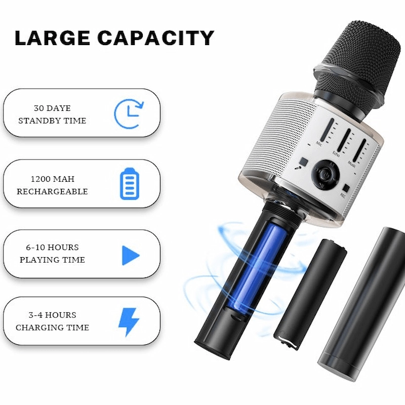 ميكروفون بلوتوث.مع المتحدث.دعم بطاقة TF، صوت عالي الجودةتأثيرات الصدى والتردد، أزرار متعددة الوظائفمصابيح LEDوظائف التسجيل وخيارات إخراج الصوتالبطارية المدمجة = 1200 مللي أمبير.ميكروفون كاريوكي.6-10 ساعات من وقت اللعب