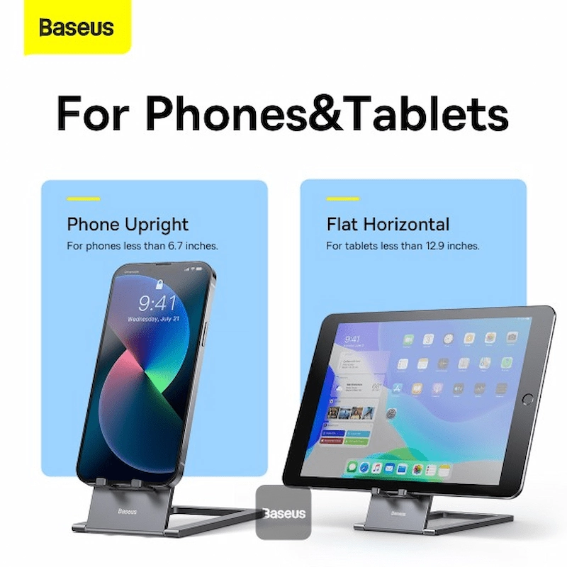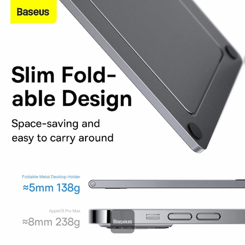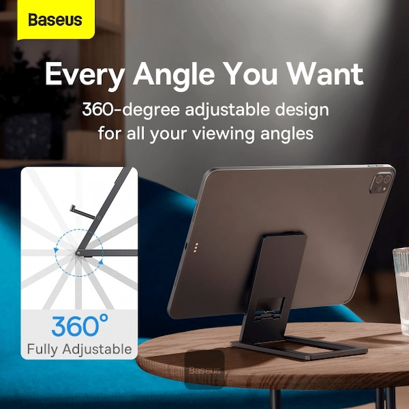 Sleek, strong, and travel-ready the Baseus Foldable Metal Desktop Holder keeps your phone or tablet perfectly positioned with 360° adjustability, a durable metal build, and a slim foldable design that slips right into your bag.