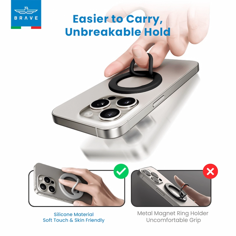 Finger Ring Grip – 360° rotating ring provides a secure, comfortable grip to prevent drops and improve handling.