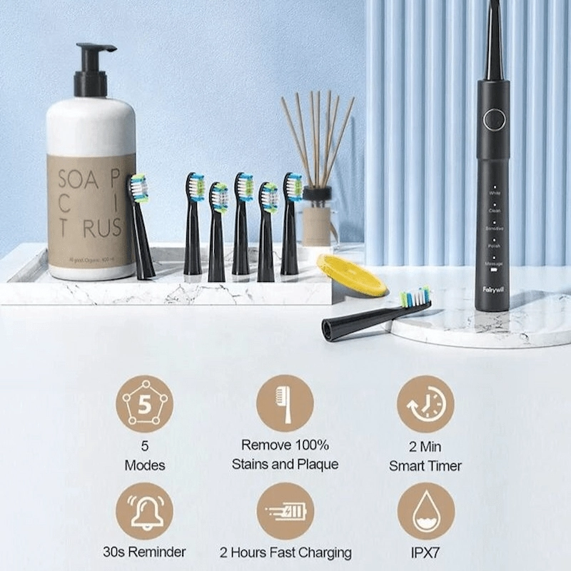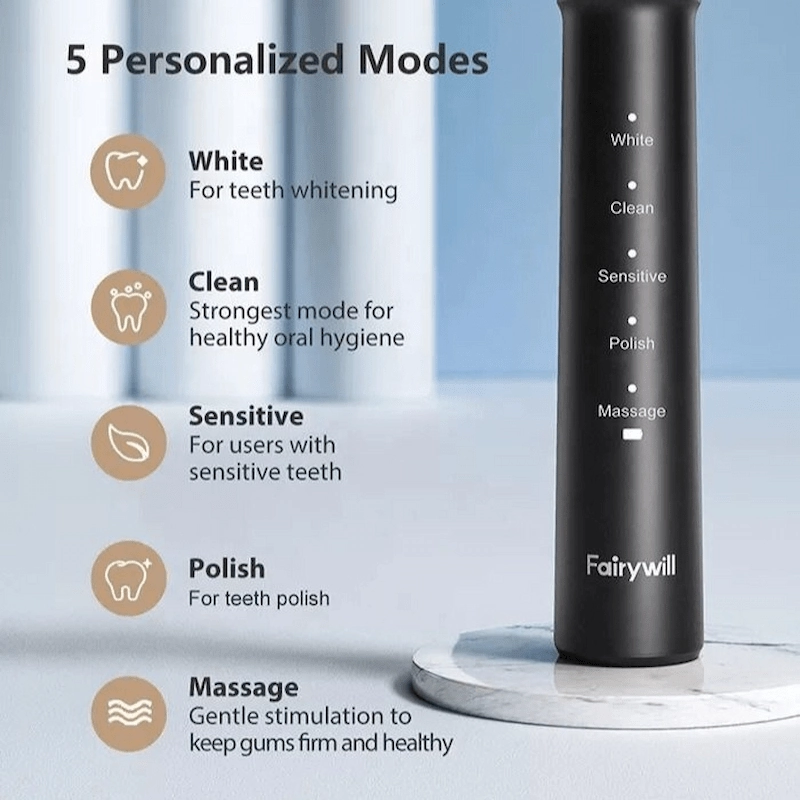 Meet your new smile booster! The Fairywill E11 combines powerful 40,000‑rpm sonic cleaning, 5 smart modes, and long-lasting battery life to give you a dentist-level clean at home—or on the go. Waterproof, travel-friendly, and packed with 8 brush heads, it’s all your oral care needs in one sleek brush.