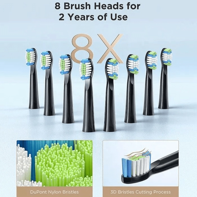 8 DuPont Brush Heads Included: enough for ~2 years of use.