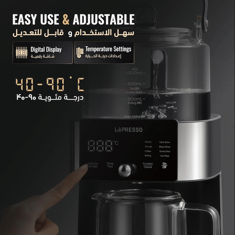 Brew the perfect cup every time with the LePresso Brewfinity! With its 1000 mL capacity, fountain brewing technology, and intuitive digital display, you can enjoy rich coffee or soothing tea just the way you like it. Keep your drinks warm for up to 30 minutes and elevate your home or office brewing experience!