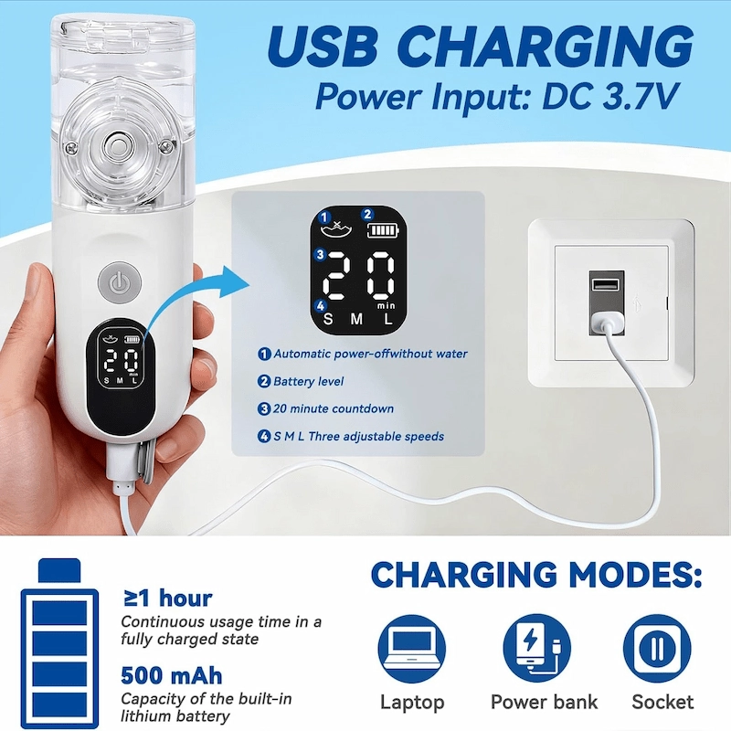 USB-C Rechargeable Power System – Modern USB-C charging allows portable, cordless operation without needing constant power connection. (Derived from product type & modern portable nebulizer design)