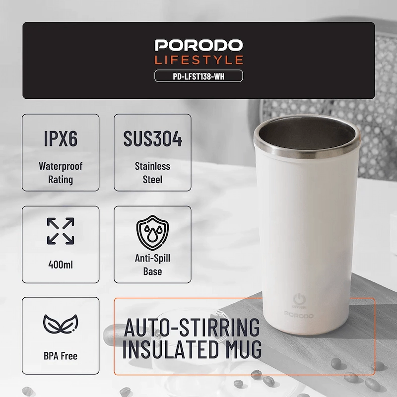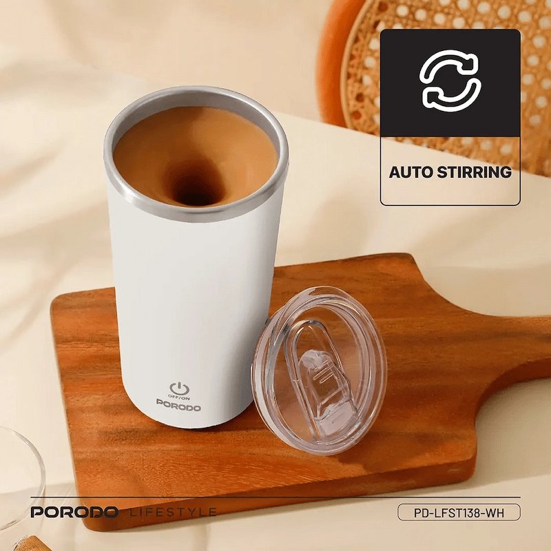 Automatic Stirring Function Equipped with a built-in motor at the base, the mug automatically stirs your drink with a single button press, ensuring your coffee, tea, or hot chocolate stays smooth and perfectly blended without the need for a spoon.