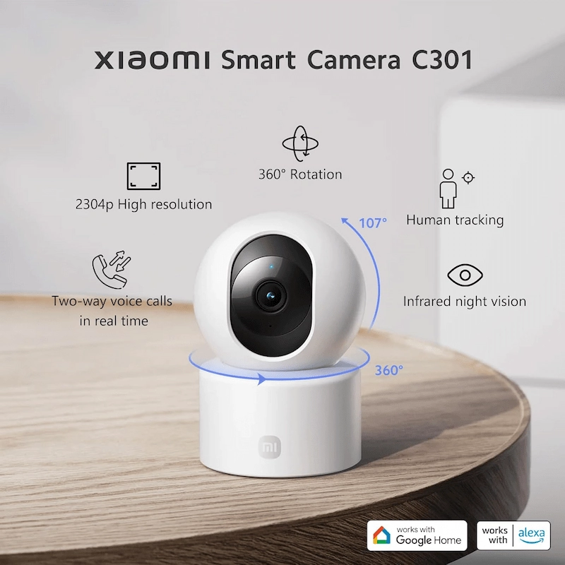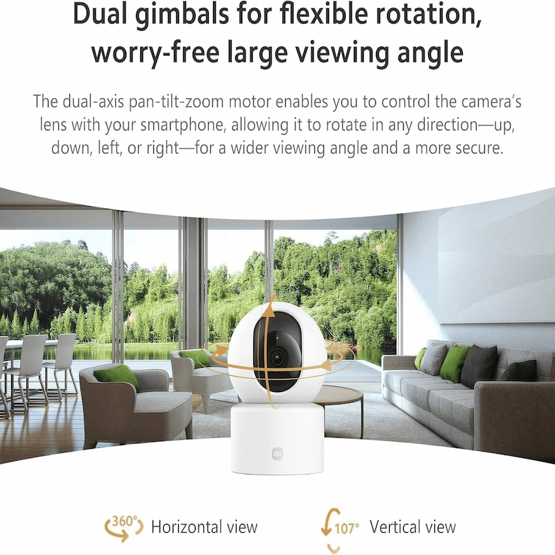 Dual-axis pan & tilt (360° horizontal, 107° vertical) for full room coverage
