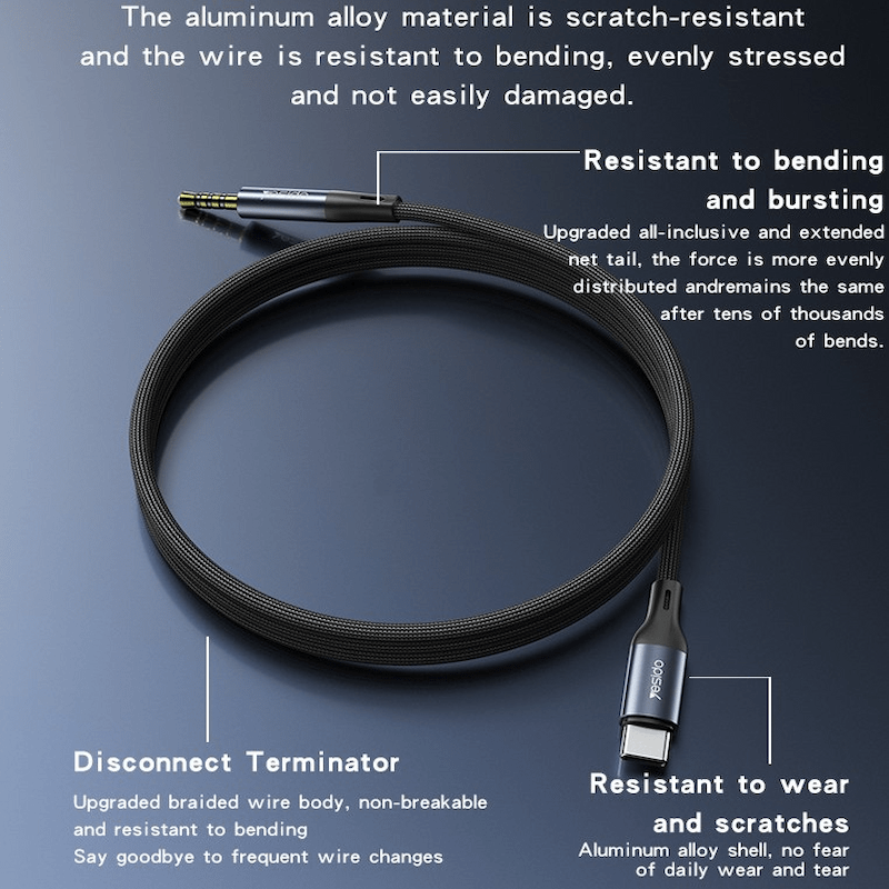 Enjoy your music anywhere with the Yesido Audio Cable USB C to AUX YAU42. This sleek cable lets you connect any USB‑C device to speakers, headphones, or car AUX ports, delivering crisp, high-quality sound. Plug-and-play, durable, and compact, it’s the perfect companion for music, calls, or podcasts on the go.