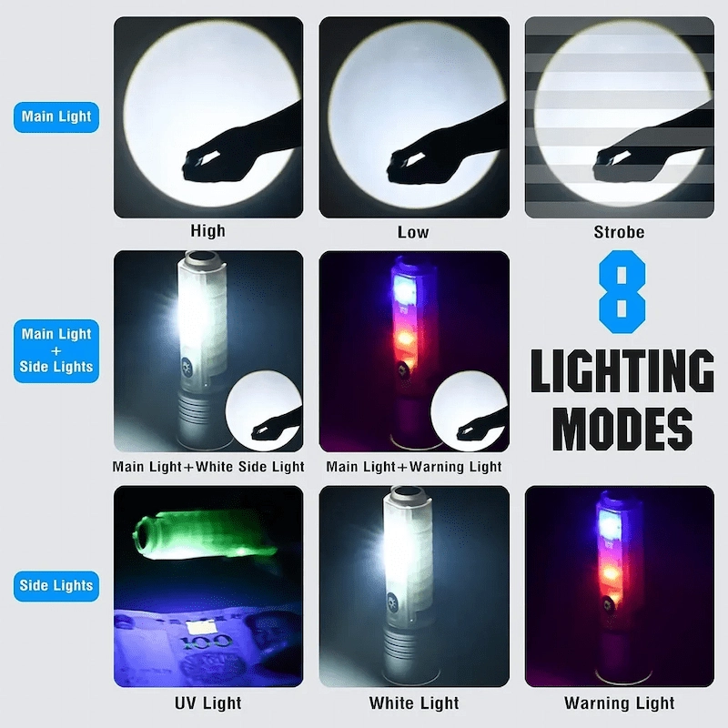 Multi-Light Side Beams – Additional LED functions (flash, strobe, and color modes depending on model) for emergency or tactical use.